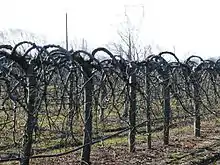 - Formes en espalier (ou plates, palissées, dirigées ou en palmettes) : haie, palmette (conduite contre un mur en horizontal, vertical ou oblique), contre-espalier (palmette conduite sans mur mais avec treillis), palissage en V (tatura), candélabre, drapeau, cordon[3]. Ce sont des formes anciennes de moins en moins utilisées car elles ne sont pas naturelles et réclament beaucoup d'entretien et d'expertise[4].