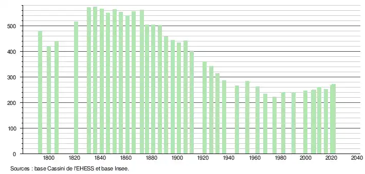 L'évolution du nombre d'habitants est connue à travers les recensements de la population effectués dans la commune depuis 1793. Pour les communes de moins de 10 000 habitants, une enquête de recensement portant sur toute la population est réalisée tous les cinq ans, les populations légales des années intermédiaires étant quant à elles estimées par interpolation ou extrapolation[67]. Pour la commune, le premier recensement exhaustif entrant dans le cadre du nouveau dispositif a été réalisé en 2005[68].