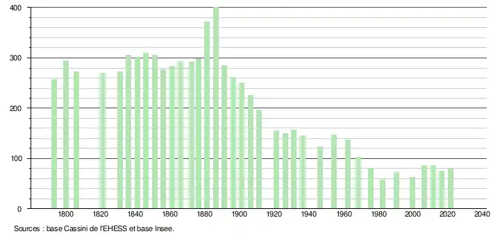 L'évolution du nombre d'habitants est connue à travers les recensements de la population effectués dans la commune depuis 1793. Pour les communes de moins de 10 000 habitants, une enquête de recensement portant sur toute la population est réalisée tous les cinq ans, les populations légales des années intermédiaires étant quant à elles estimées par interpolation ou extrapolation[16]. Pour la commune, le premier recensement exhaustif entrant dans le cadre du nouveau dispositif a été réalisé en 2006[17].