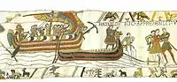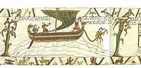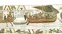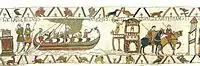 Ensuite, la broderie montre, avec un grand luxe de détails (trois scènes : 35 à 37), les préparatifs de Guillaume pour son invasion de l'Angleterre effectuée dans la nuit du 27 au . La scène 38 montre la traversée de la Manche par la flotte normande. Au centre de la scène, on voit clairement le vaisseau de Guillaume, dont la poupe est ornée d'une figure. L'existence de ce bateau, le Mora, que la reine Mathilde avait équipé, nous est connue par un texte anonyme, la Liste des navires[73]. Dans ce document, le petit personnage figure cependant à la proue du bateau. Le texte signale que les navires se dirigent vers Pevensey. De nos jours, cette localité se trouve à l'intérieur des terres, mais au XIe siècle, elle se trouvait au fond d'une baie. La broderie se poursuit par les représentations du débarquement, de l'installation des Normands, puis de la bataille d'Hastings du .