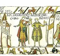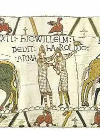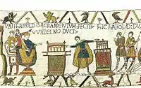 La première moitié de la broderie relate les aventures du comte Harold Godwinson, beau-frère du roi Édouard le Confesseur, dont le navire débarqua à la suite d'un naufrage ou d'une tempête sur les terres du comte Guy de Ponthieu (dans la Somme actuelle) en 1064. Il fut capturé par Guy, qui envisageait de le libérer contre rançon. Une scène montre Harold en pourparlers avec Guy de Ponthieu. Ils sont observés par un personnage dissimulé derrière un pilier. Selon une interprétation, il pourrait s'agir d'un espion du duc Guillaume[68]. Quoi qu'il en soit, dans la scène suivante, deux Normands se présentent au château de Guy. Guillaume exigea de Guy qu'il lui remît Harold, ce qui fut fait. Plusieurs scènes sont ensuite consacrées à l'expédition du duc Guillaume contre le duc Conan II de Bretagne (scènes 16 à 20). Au terme de cette expédition, Guillaume donne des armes à Harold. Lucien Musset rappelle que cette scène a souvent été interprétée comme une des premières représentations d'adoubement, mais préfère y voir une simple reconnaissance par Guillaume des services rendus par Harold en Bretagne[69]. P. Bouet et F. Neveux rejettent absolument l'idée qu'il s'agisse d'un épisode d'adoubement[70]. Ils se rendent ensuite à Bayeux, où Harold jure, sur deux reliquaires à Guillaume, de le soutenir pour succéder à Édouard sur le trône d’Angleterre. Il revint sur cette promesse plus tard, ce qui lui valut son excommunication par le pape. La broderie montre ensuite Harold retourner en Angleterre et se faire acclamer roi après la mort d'Édouard.