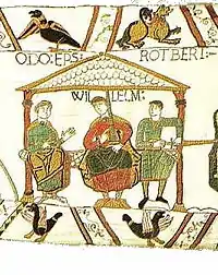 Odon de Conteville (demi-frère de Guillaume le Conquérant et évêque de Bayeux de 1049 à 1097), est généralement identifié comme étant le commanditaire de la tapisserie de Bayeux[5],[21]. La supposition repose sur un faisceau d'indices[22]. Tout d'abord, sur la tapisserie ne sont nommées, en dehors des figures historiques (Harold Godwinson, Édouard le Confesseur, Guillaume le Conquérant, etc.) et de la mystérieuse Ælfgyva, que trois personnes, Wadard, Vital et Turold[23]. Celles-ci ne sont mentionnées dans aucune autre source contemporaine de la bataille d'Hastings[23]. Or il apparaît que ces hommes sont tous des tenants d'Odon dans le Kent[23], signe qu'ils faisaient partie des hommes qu'Odon a amenés à la bataille. Ensuite, la tapisserie montre Harold Godwinson jurant fidélité au duc Guillaume, sur de saintes reliques, et assistance pour son obtention du trône anglais, à Bayeux[24],[23]. Orderic Vital place l'événement à Rouen, et Guillaume de Poitiers à Bonneville-sur-Touques. De plus, le rôle d'Odon à Hastings est à peine mentionné dans les sources qui ne sont pas liées à Bayeux[24]. L'immense majorité des historiens concluent qu'Odon est le seul à avoir eu les moyens financiers de commanditer une œuvre aussi gigantesque, et qui mette en avant ses tenants et les reliques de Bayeux[23]. Des thèses nouvelles au sujet du commanditaire voient parfois encore le jour[6]. Selon l'une d'entre elles, la reine Édith, veuve d'Édouard le Confesseur et sœur de Harold serait la commanditaire[25] : la tapisserie pourrait avoir été un moyen d'assurer Guillaume de sa loyauté, tout en ne montrant pas Harold sous un jour franchement défavorable. De son côté, Andrew Bridgeford penche pour un autre candidat, Eustache II, comte de Boulogne, qui avait également des choses à se faire pardonner par Guillaume[26]. Aucune de ces deux nouvelles thèses n'a emporté l'adhésion de la communauté académique.
