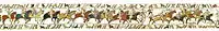 Au-dessus et au-dessous de la bande narrative centrale se trouvent des bordures d'environ cm de hauteur, délimitées par une fine ligne brodée au point de tige. Ces bordures contiennent des motifs très divers (animaux réels, sauvages ou domestiques ; créatures fantastiques ; scènes inspirées de fables antiques (on identifie facilement Le Corbeau et le Renard, Le Loup et l'Agneau[76]) ; activités agricoles ; scènes de nudité…) séparés par des traits obliques, simples ou doubles[Note 11]. À partir du milieu de la scène 53, la bordure inférieure illustre la bataille : cadavres, parfois démembrés ou décapités ; armes éparpillées ; corps que l'on dépouille de leur armures ; hommes se disputant un bouclier… Dans ce chaos, de petits archers décochent leurs flèches vers la zone médiane.