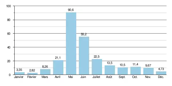 En ce qui concerne la période estivale, la plus importante car libre de glaces (de mai à septembre inclus), le débit minimal observé a été de 1,13 m3/s en , ce qui illustre le fait que des étiages sévères peuvent aussi se produire en été.