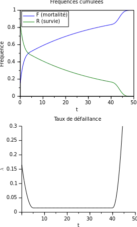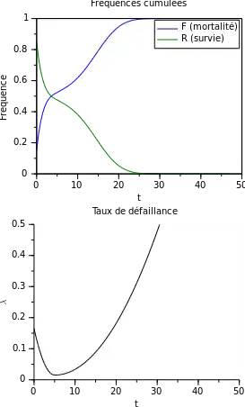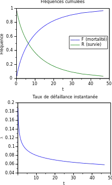 comme la probabilité de défaillance représente la variation (négative) de la population, on a aussi :