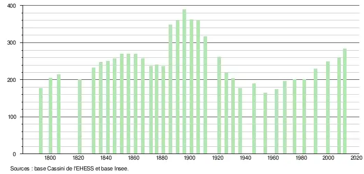 L'évolution du nombre d'habitants est connue à travers les recensements de la population effectués dans la commune depuis 1793. À partir du , les populations légales des communes sont publiées annuellement dans le cadre d'un recensement qui repose désormais sur une collecte d'information annuelle, concernant successivement tous les territoires communaux au cours d'une période de cinq ans. Pour les communes de moins de 10 000 habitants, une enquête de recensement portant sur toute la population est réalisée tous les cinq ans, les populations légales des années intermédiaires étant quant à elles estimées par interpolation ou extrapolation[5]. Pour la commune, le premier recensement exhaustif entrant dans le cadre du nouveau dispositif a été réalisé en 2007[6],[Note 1].