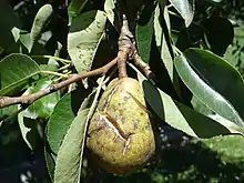 La tavelure du poirier est une maladie fongique qui affecte les poiriers (genre Pyrus spp.), causée par un champignon ascomycète, Venturia pyrina.