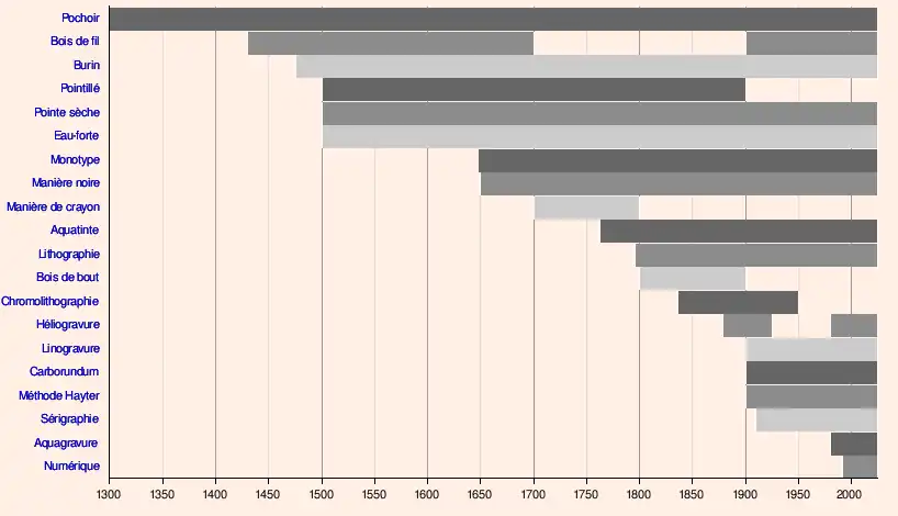 Voici les périodes significatives d'application des principales techniques de gravure et d'impression[1] :