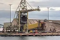 - Terminal d’exportation d’acier : équipé de huit grues portiques, il traite plus d’un million de tonnes d’exportation de dalles d’acier par an. Il manipule également des importations de bois, y compris le bois dur tropical, la fibre de bois, plus le bois d’œuvre résineux et la pulpe de Scandinavie[4].
