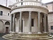 Selon les projets initiaux, le temple aurait dû être inséré au centre d'une cour circulaire non réalisée (celle actuelle est de forme quadrangulaire), de manière à mettre en évidence la symétrie parfaite de l'ensemble et souligner la centralité du temple dont la structure rayonnait dans la cour, projetant les seize colonnes en seize autres pour former un portique circulaire, comme on peut le voir dans une reconstruction de Serlio. Ce projet original n'aurait permis la vue du temple que depuis une position assez proche, donnant au petit bâtiment un aspect beaucoup plus imposant et massif, selon une recherche en perspective précise[8].