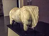 La tête et les extrémités de cette très grande statue (1,25 m de long) ont été perdues. L'identification avec Apis serait justifiée par la similitude avec un spécimen en bronze d'Herculanum , mais elle n'est pas unanimement reconnue. Cette représentation, tout en rappelant celle égyptienne, est revisitée avec un naturalisme hellénistique détaillé. La tête était dressée, une patte avant relevée, les organes génitaux bien visibles[15].