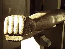 Cependant, de grands débris de colosses en granite ont été retrouvés plus au centre de l'enceinte, démontrant qu'à cet endroit se trouvait probablement un grand portail. Ils ont été d'abord repérés puis mesurés par les savants de l'expédition d'Égypte à la fin du XVIIIe siècle avant d'être embarqués pour l'Europe. Ils sont actuellement visibles au British Museum de Londres et témoignent de la présence d'une statue royale monumentale en position debout.