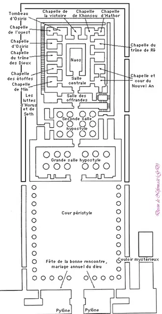 Le sanctuaire, proprement dit, est composé d'un naos précédé ou non d'un pronaos et entouré ou non de chapelles accessibles via un déambulatoire intérieur. On pouvait parfois trouver, juste devant le naos, une chapelle reposoir de la barque sacrée du dieu qui, lors de certaines processions publiques, servait à transporter la statue du dieu. Le sanctuaire est généralement entouré d'un déambulatoire extérieur le séparant du mur d'enceinte en pierre et communiquant avec la cour du temple. Depuis différents accès du temple, des escaliers permettent d'atteindre la terrasse située au-dessus du sanctuaire. D'autres permettent d'accéder à l'intérieur des pylônes.