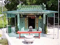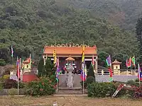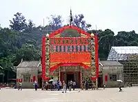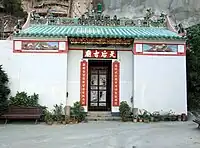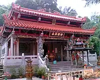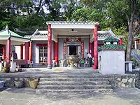 Temple de Tin Hau de Chek Lap Kok (zh-yue) (東涌赤鱲角天后宮), ou Temple de Tin Hau de Tung Chung (東涌天后宮) Construit en 1823 au nord-est de Chek Lap Kok. L'ensemble du temple a été construit en granit extrait sur l'île[18]. Restauré en 1978[14]. Détruit en 1991 en raison de la construction du nouvel aéroport, puis reconstruit en 1994 à son emplacement actuel[9],[19].  |