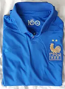 Le , pour le premier France-Angleterre de l'histoire (et une défaite 15-0), la France évolue en maillot rouge (short bleu, bas rouge) : ceci est la première utilisation d'une rechange (les Anglais portaient eux aussi un maillot blanc...)[2]. Cette même rechange passant du rouge au bleu à partir de la rencontre Angleterre-France (défaite 12-0) du , premier match de l'équipe de France avec un maillot bleu, un short blanc et des bas rouges[3]. Contrairement à ce que de nombreuses sources affirment[4],[5], l'emblème du coq gaulois n'est pas apparu officiellement sur le maillot en 1909, mais plus vraisemblablement en 1920[6],[7].