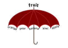 Un terme générique représentant plusieurs termes spécifiques. Par exemple, le terme « fruits » regroupe l’orange, la poire, la banane, etc.