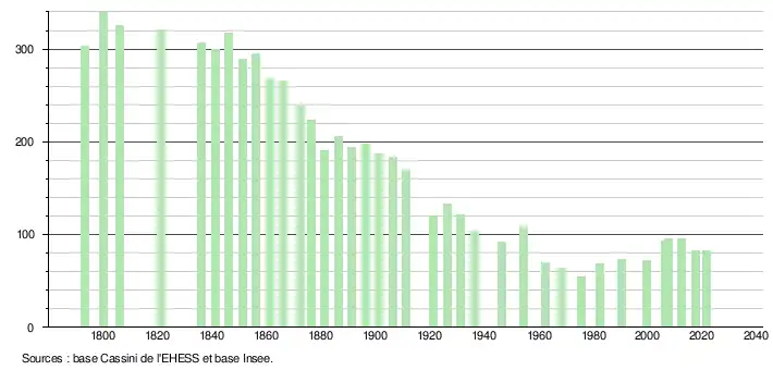 L'évolution du nombre d'habitants est connue à travers les recensements de la population effectués dans la commune depuis 1793. Pour les communes de moins de 10 000 habitants, une enquête de recensement portant sur toute la population est réalisée tous les cinq ans, les populations légales des années intermédiaires étant quant à elles estimées par interpolation ou extrapolation[22]. Pour la commune, le premier recensement exhaustif entrant dans le cadre du nouveau dispositif a été réalisé en 2007[23].