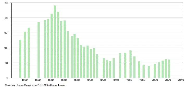 L'évolution du nombre d'habitants est connue à travers les recensements de la population effectués dans la commune depuis 1793. Pour les communes de moins de 10 000 habitants, une enquête de recensement portant sur toute la population est réalisée tous les cinq ans, les populations légales des années intermédiaires étant quant à elles estimées par interpolation ou extrapolation[14]. Pour la commune, le premier recensement exhaustif entrant dans le cadre du nouveau dispositif a été réalisé en 2006[15].