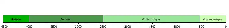 L'âge de la Terre est aujourd'hui estimé à 4,54 milliards d'années[1]. L'histoire de la Terre est divisée en quatre grands intervalles de temps, dits éons, dont la frise est donnée ci-dessous (en millions d'années)[2] :