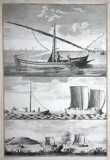 Chaque bâtiment porte de nombreux doris qui sont mis à l'eau les jours de pêche, à moins que celle-ci soit faite au moyen de lignes traînées de part et d'autre du navire.