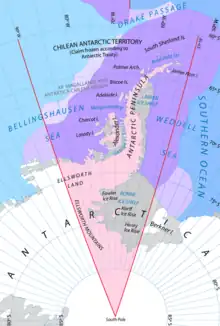 |   Carte de la revendication chilienne en Antarctique La revendication est suspendue par le traité sur l'Antarctique | |