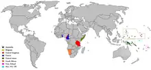 | .svg.png.webp) Tanganyika | .svg.png.webp) Royaume-Uni | Afrique orientale allemande |  Empire colonial allemand | Indépendance accordée en 1961. Fédéré avec l'ancien protectorat britannique de Zanzibar en 1964 pour former la Tanzanie. |  Tanzanie |