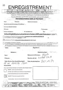 Il existe trois tests antigéniques autorisés en France : le test antigénique nasopharyngé (réalisé par des professionnels), le test antigénique nasal (réalisé par des professionnels) et l'auto-test antigénique nasal (réalisé par la personne elle-même) qui peut être supervisé par un professionnel pour l'obtention du pass sanitaire. Les tests par prélèvement nasal au lieu de nasopharyngé sont moins profonds[28],[42]. Il existe également des tests antigéniques salivaires mais qui ne sont plus remboursés car pas assez fiables, contrairement aux tests PCR salivaires[43].