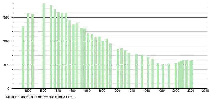 L'évolution du nombre d'habitants est connue à travers les recensements de la population effectués dans la commune depuis 1793. Pour les communes de moins de 10 000 habitants, une enquête de recensement portant sur toute la population est réalisée tous les cinq ans, les populations légales des années intermédiaires étant quant à elles estimées par interpolation ou extrapolation[29]. Pour la commune, le premier recensement exhaustif entrant dans le cadre du nouveau dispositif a été réalisé en 2004[30].