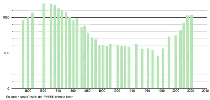 L'évolution du nombre d'habitants est connue à travers les recensements de la population effectués dans la commune depuis 1793. Pour les communes de moins de 10 000 habitants, une enquête de recensement portant sur toute la population est réalisée tous les cinq ans, les populations légales des années intermédiaires étant quant à elles estimées par interpolation ou extrapolation[32]. Pour la commune, le premier recensement exhaustif entrant dans le cadre du nouveau dispositif a été réalisé en 2005[33].