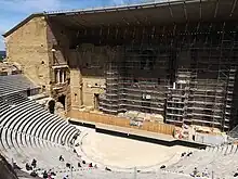 La scène, faite d'un plancher de bois sous lequel était logée la machinerie, mesure 61 m de longueur pour 9 m de profondeur utile : elle dominait l'orchestra d'environ 1,10 m, soutenue par un mur bas, le pulpitum. En arrière se trouve la fosse du rideau (qu'on abaissait pendant les représentations). Le mur de scène (frons scænæ)[Note 1] mesurant 35 m était jadis décoré de statues, frises et colonnes de marbre, dont subsistent quelques vestiges. Ce mur est percé de trois portes : la porte royale au centre et les deux portes latérales (entrée des acteurs secondaires). Au-dessus de la porte royale se trouve une frise de centaures haute de 0,70 m. La niche du mur de scène abrite une statue colossale, de 3,50 m de haut, dont la tête n'est pas d'origine. Elle est considérée par certains comme une statue de l'empereur Auguste, mais selon d'autres, elle serait bien postérieure à cet empereur. Elle serait datée du IIe siècle apr. J.-C.