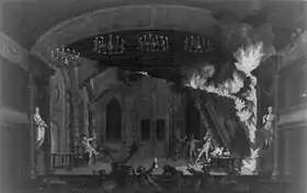 La machinerie de scène était certainement ce qu'il y avait de plus sensationnel. Il y avait des coulisses et des décors rapidement interchangeables, peints de motifs en perspective. Par des décors, des fermes, des machines et des trappes, contrebalancés par des poids, on pouvait faire descendre des personnes ou toutes sortes d'objets du ciel ou les faire disparaître dans le sol. Il était de coutume d'arrêter de temps à autre l'action dramatique pendant la représentation en mettant en scène un « tableau vivant ». Avec un tel tableau vivant, souvent composé, de manière somptueuse, de personnages immobiles aux gestes expressifs, en alternance avec les textes, on accentuait les points culminants visuels[18],[19].