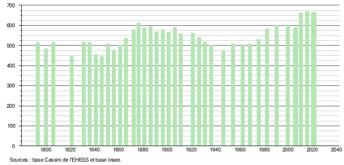 L'évolution du nombre d'habitants est connue à travers les recensements de la population effectués dans la commune depuis 1793. Pour les communes de moins de 10 000 habitants, une enquête de recensement portant sur toute la population est réalisée tous les cinq ans, les populations légales des années intermédiaires étant quant à elles estimées par interpolation ou extrapolation[27]. Pour la commune, le premier recensement exhaustif entrant dans le cadre du nouveau dispositif a été réalisé en 2005[28].