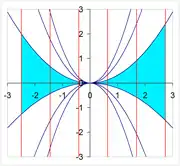 Cet exemple est illustré avec les mêmes conventions sur la figure de droite. La zone bleue en haut à gauche est transformée en une espèce de papillon délimité par deux paraboles. L'application n'est pas inversible au voisinage d'un point ayant une première coordonnée nulle. Intuitivement, il est visible que les deux figures bleues ne sont pas équivalentes : si l'on retranche le point central à celle de droite, la figure comporte alors deux composantes connexes. Le retrait d'un point quelconque sur la figure bleue à gauche ne produit jamais cet effet.