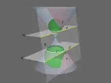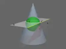 - il existe deux sphères à la fois tangentes au cône et au plan de la conique (de part et d'autre de ce plan pour l'ellipse et d'un même côté de ce plan pour l'hyperbole) ;