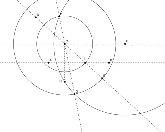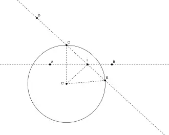 On cherche alors à construire la longueur CI en utilisant la puissance d'un point par rapport à un cercle. Il suffit de construire un cercle Γ pour lequel la puissance du point C soit CC'2. Tout cercle passant par C' et dont le centre F est situé sur la parallèle à (AB) passant C convient. Il faut en outre choisir le cercle assez grand pour que le cercle de centre C et passant par E coupe le cercle Γ en G