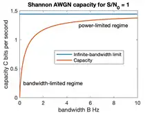 auquel cas la capacité est logarithmique en puissance et approximativement linéaire en largeur de bande (pas tout à fait linéaire, puisque N augmente avec la largeur de bande, ce qui confère un effet logarithmique). C'est ce qu'on appelle le régime à bande passante limitée.