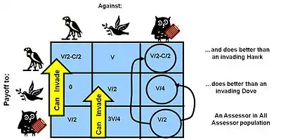 Matrice des gains pour le jeu Faucon-Colombe avec l'ajout de la stratégie de l'évaluateur. Celui-ci "étudie son adversaire", se comportant comme un faucon lorsqu'il est jumelé à un adversaire qu'il juge "plus faible", comme une colombe lorsque l'adversaire semble plus grand et plus fort. Le fait de jouer comme Assesseur est une ESS, car l'Assessur peut envahir les populations de faucons et de colombes, et peut résister à l'invasion de mutants de faucons ou de colombes.