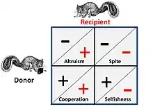 • Dans une relation altruiste, le donneur, fournit un avantage au receveur, avec un coût pour lui-même. Dans le cas général, le receveur aura un lien de parenté avec le donneur et le don est à sens unique. Les comportements où les bénéfices sont donnés alternativement (dans les deux sens) à un coût, sont souvent qualifiés d'altruistes, mais à l'analyse, un tel "altruisme" peut être considéré comme découlant de stratégies "égoïstes" optimisées.