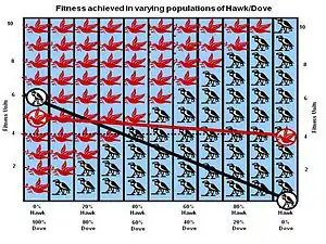 • une stratégie optimale : cela maximiserait la fitness, et de nombreux états de l'ESS sont bien en dessous de la fitnessmaximale réalisable dans un paysage de fitness (voir le graphique Faucon-Colombe ci-contre à titre d'exemple) ;