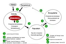 - (en) Cet article est partiellement ou en totalité issu de l’article de Wikipédia en anglais intitulé « Metabolic theory of ecology » (voir la liste des auteurs).