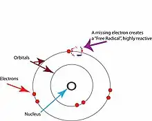 Les radicaux libres sont des atomes ou des molécules possédant des électrons isolés[2]. Dans les atomes ou les molécules, les électrons sont normalement groupés par paires le long d'orbitales[17]. Les radicaux libres, qui ne comportent qu'un seul électron sur chacune de leurs orbitales, sont en principe instables et ont tendance à perdre ou à capturer un électron pour perdre ou saturer leur couche externe[17].