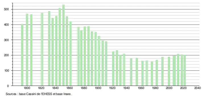 L'évolution du nombre d'habitants est connue à travers les recensements de la population effectués dans la commune depuis 1793. Pour les communes de moins de 10 000 habitants, une enquête de recensement portant sur toute la population est réalisée tous les cinq ans, les populations légales des années intermédiaires étant quant à elles estimées par interpolation ou extrapolation[18]. Pour la commune, le premier recensement exhaustif entrant dans le cadre du nouveau dispositif a été réalisé en 2007[19].