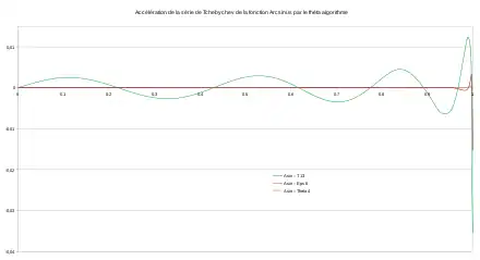 Le graphique ci dessous compare la fonction Arc sinus avec sa série de Tchebychev en retenant les 7 premiers termes (série de Tchebychev de degré 13), ainsi que la valeur accélérée de cette série partielle par l'ε-algorithme et le θ-algorithme. Avec 7 termes, l'ε-algorithme a pu être poussé jusqu'à la 6ème colonne, et le θ-algorithme, jusqu'à la 4ème colonne.