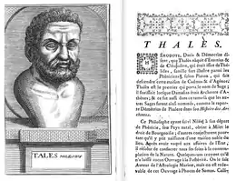 Thalès de Milet, appelé communément Thalès (en grec ancien : Θαλῆς ὁ Μιλήσιος / Thalễs ho Milếsios), est un philosophe et savant grec, né à Milet vers 625-620 av. J.-C. et mort vers 548-545 av. J.-C. dans cette même ville[1],[2],[3].