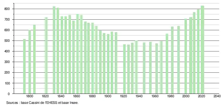 L'évolution du nombre d'habitants est connue à travers les recensements de la population effectués dans la commune depuis 1793. Pour les communes de moins de 10 000 habitants, une enquête de recensement portant sur toute la population est réalisée tous les cinq ans, les populations légales des années intermédiaires étant quant à elles estimées par interpolation ou extrapolation[17]. Pour la commune, le premier recensement exhaustif entrant dans le cadre du nouveau dispositif a été réalisé en 2005[18].