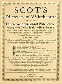 Le livre de Scot est intitulé (traduction littérale du titre anglais) La Divulgation de la sorcellerie, où les agissements indécents des sorcières et de ceux qui font commerce de sorcellerie sont révélés au grand jour, en seize livres… comportant un Traité sur la Nature et la Substance des Esprits et Démons. À la fin du volume, l'imprimeur donne son nom : William Brome.