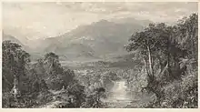 - Texte original en anglais : « Imagine yourself, late in the afternoon with the sun behind you, to be travelling up the valley along the bank of a river, at an elevation above the hot country of some five or six thousand feet. At the point to which you have ascended, heavily-wooded mountains close in on either hand, (not visible in the picture – only the foot of each jutting into view,) richly clothed with trees and all the appendage of the forest, with the river flowing between them. ... Conspicuous on the opposite side of the river is the road leading into the country above, a wild bridle-path in the brightest sunshine, winding up into, and losing itself in the thick shady woods. The foreground ... forms of itself a scene of unrivalled power and brilliancy, ...[8] »