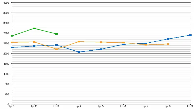 | 3 | Lundi à 21 h 00 | 2 438 000 | 10 % | [10] | 2 369 000 | 10 % | [11] | 2 250 000 | 10,6 % | [12] | ||||