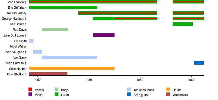 Quand John Lennon réalisa qu'il voulait faire sa propre musique, il décida de lancer un groupe de skiffle. Il commença par recruter son meilleur ami, Pete Shotton. Lennon était au chant et à la guitare, tandis que Shotton jouait du washboard, un instrument de percussion utilisé pour la rythmique. Après une semaine d'existence sous le nom « The Black Jacks », ils se rebaptisèrent « The Quarrymen » (parce qu'un autre groupe de skiffle plus connu utilisait déjà ce nom). Une semaine plus tard, ils recrutèrent un autre ami d'école, Bill Smith, pour jouer de la tea-chest bass, une basse à une corde faisant résonner une caisse à thé, et ce en dépit des réticences de Shotton qui s'était battu avec lui.