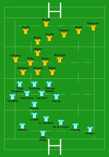 | Essai(s) : 7 Imhoff (1re), Gallo (5e, 63e), de la Fuente (23e), González (30e), Boffelli (77e), Albornoz (80e+1) Pénalité(s) : 1 Boffelli (53e) |